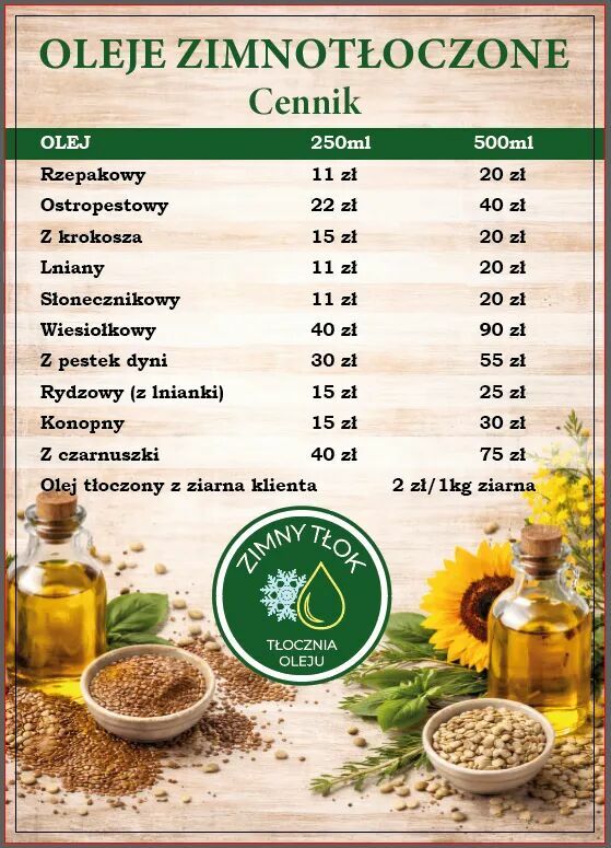 Dzień dobry,Oferuję naturalne oleje roślinne tłoczone na zimno. Są nierafinowane, niefiltrowane i powstają z wyselekcjonowanych nasion. Tłoczymy je w małych partiach, dzięki czemu oleje są świeże i zachowują swój naturalny smak oraz skład.